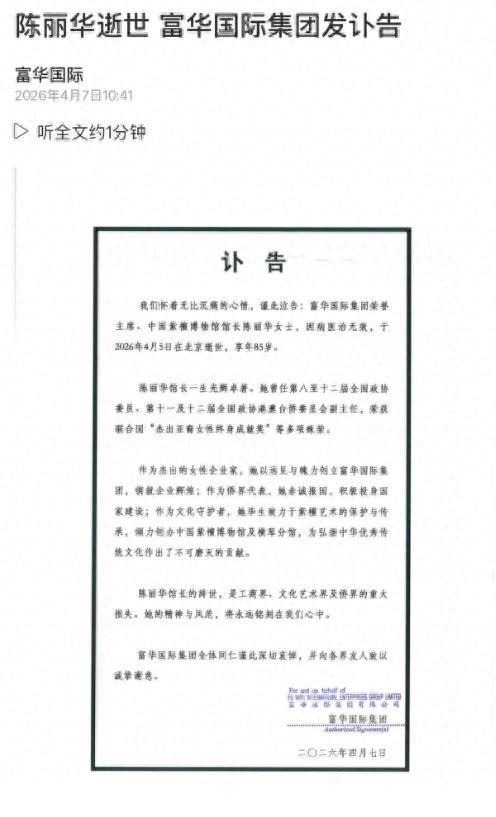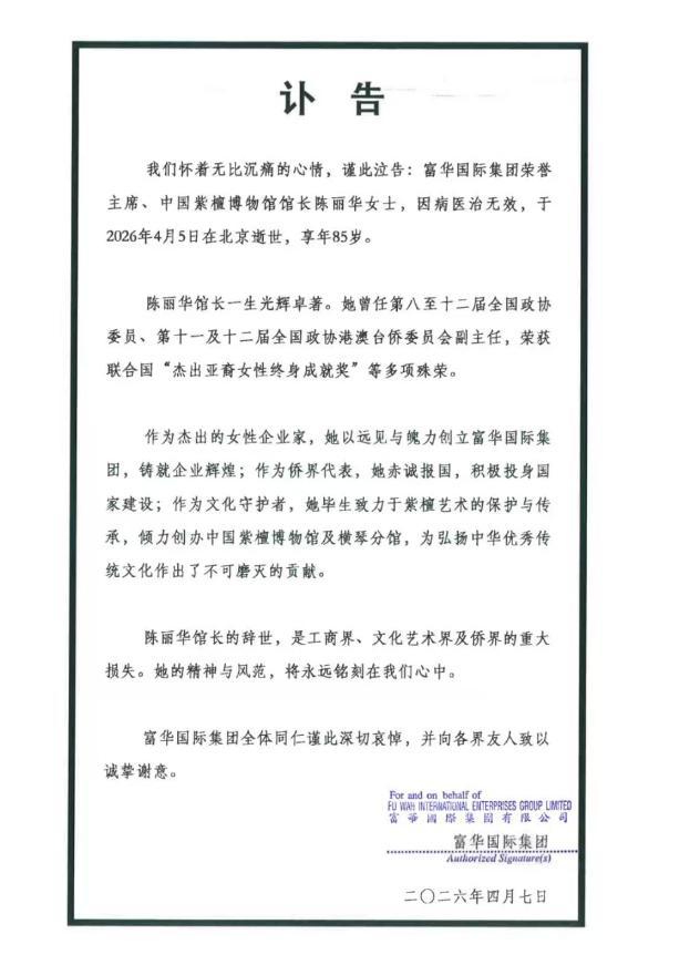富华国际集团荣誉主席、中国紫檀博物馆馆长陈丽华女士,因病医治无效,于 2026年4月5日 在北京逝世,享年85岁。
