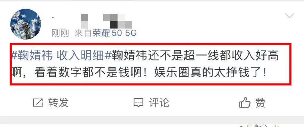网友感叹鞠婧祎还不是超一线大明星,收入都这么高,半年5000多万,那么一年就是上亿元,为什么那么多人渴望成为明星,这收入诱惑力太大了。